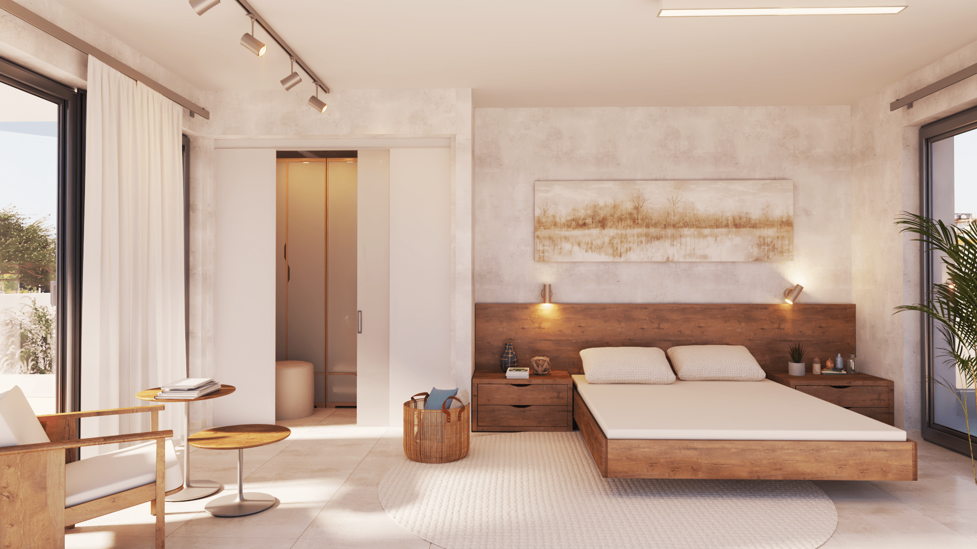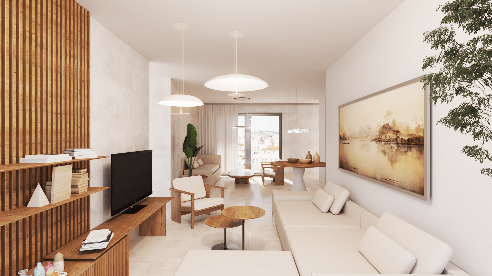 The 5th floor includes a bright open-plan living and kitchen area, one master bedroom, and a full bathroom. Expansive terraces extend the living space and offer exceptional natural light and open views. An internal staircase leads to the 6th floor, which features a second master bedroom, a second full bathroom, and wraparound terraces with greenery that ensure privacy and a relaxing atmosphere.