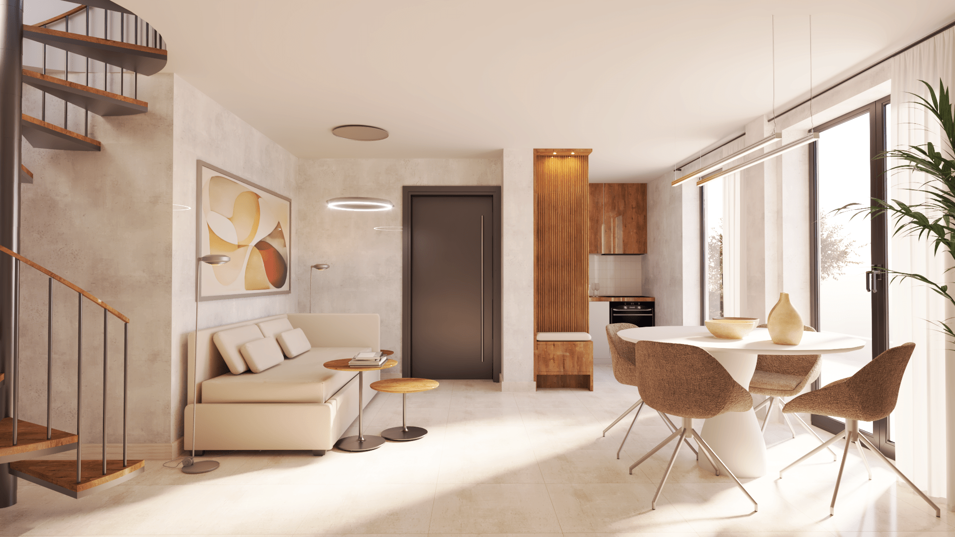 Maisonette E1 is a premium two-level residence under construction in the peaceful yet fast-developing neighborhood of Ampelokipoi. Spanning 115 sq.m. across the 5th and 6th floors of a modern building, it offers a unique sense of independence, light-filled interiors, and sweeping city views.
