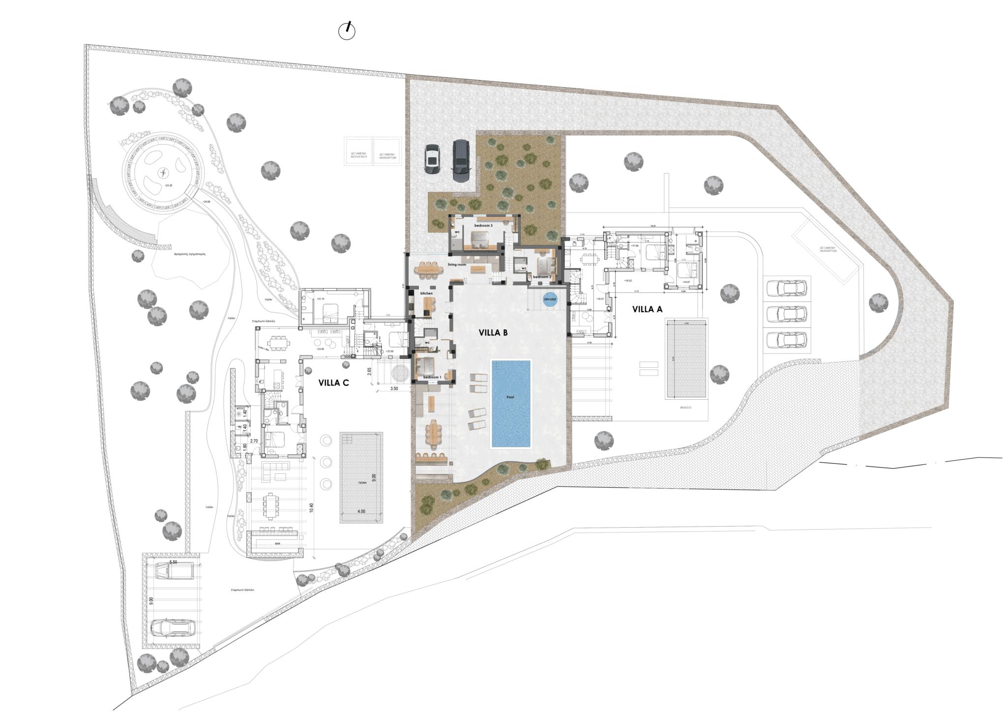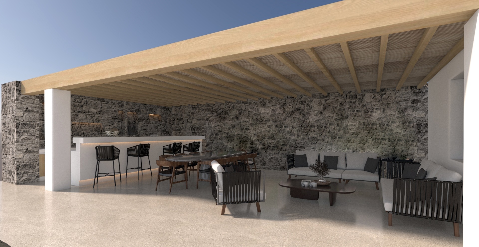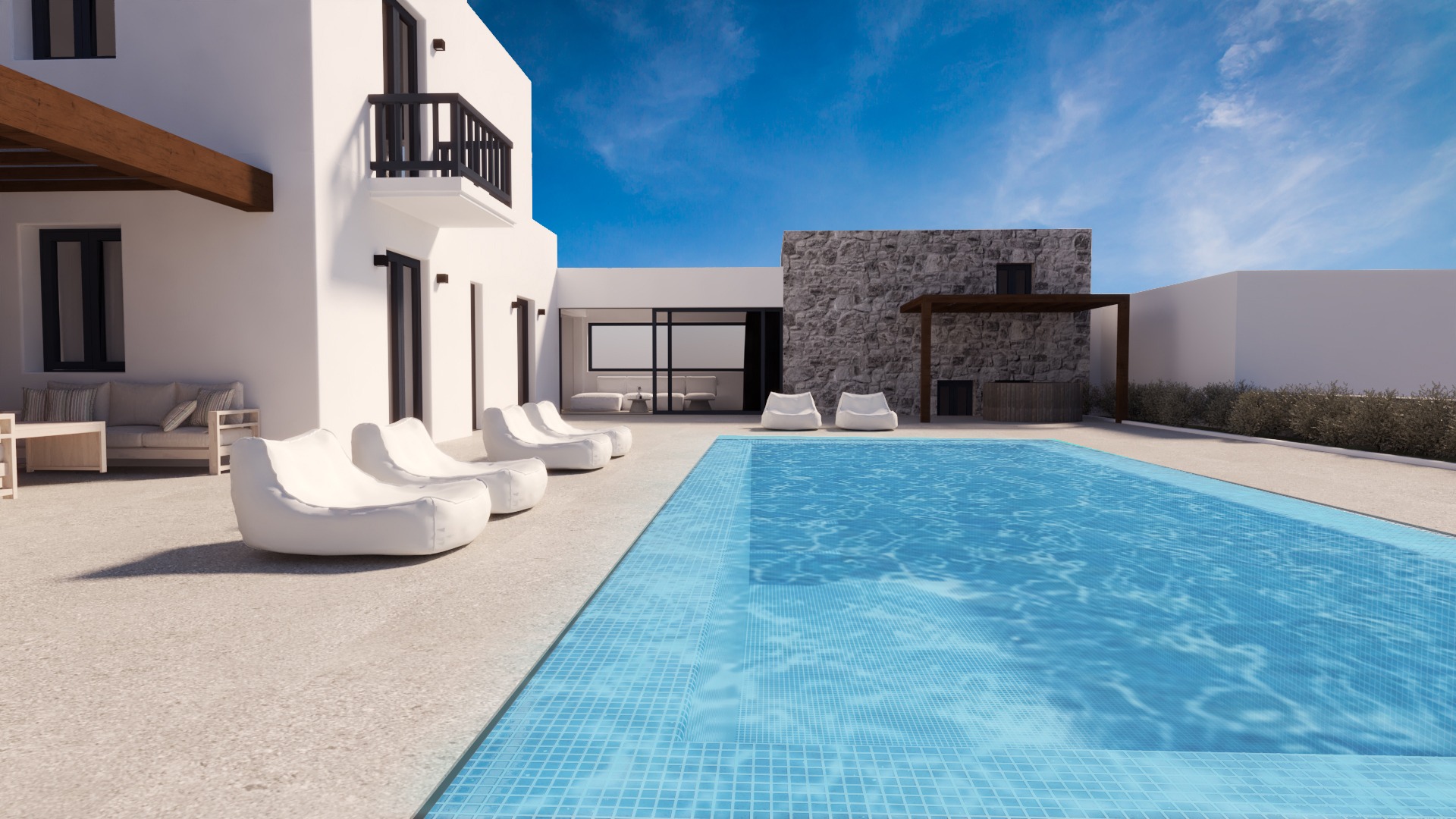 The villa spans 171 sq.m. across two levels and is thoughtfully designed to reflect Cycladic elegance with contemporary luxury. The outdoor areas are centered around a large private swimming pool, flanked by wooden sunbeds and stone walkways. A Mediterranean garden of aromatic native plants creates a seamless extension of the interior living spaces. A shaded pergola lounge completes the alfresco experience, ideal for dining, lounging, or enjoying Mykonos’s world-famous sunsets.